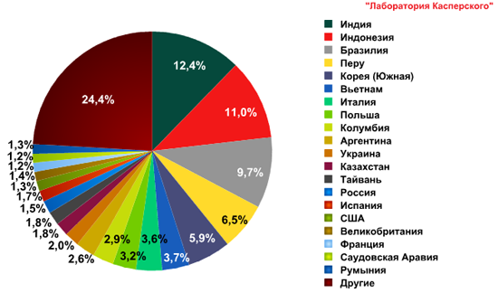 Лидером среди стран-распространителей спама в очередной раз стала Индия, с территории которой было распространено 12,4% всей мусорной корреспонденции. Что касается России, то наша страна продолжает фигурировать в первой строчке рейтинга государств по срабатыванию почтового антивируса. Исследования показывают, что больше всего писем с вредоносными вложениями (15,3%) фиксируется экспертами "Лаборатории Касперского" именно в почтовых ящиках россиян.